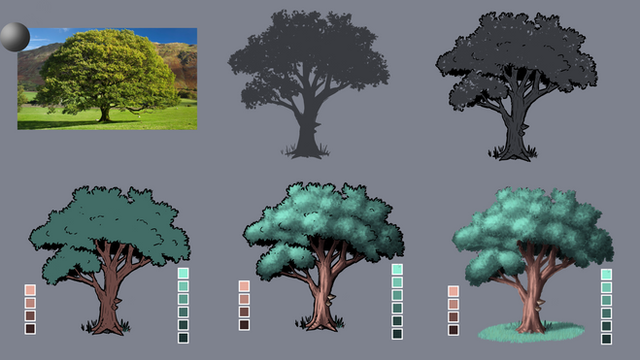Neat advices I would also add that some software (like SpeedTree) can generate trees to find more inspiration (or to lazily export them in PNG and them merge these trees into your picture