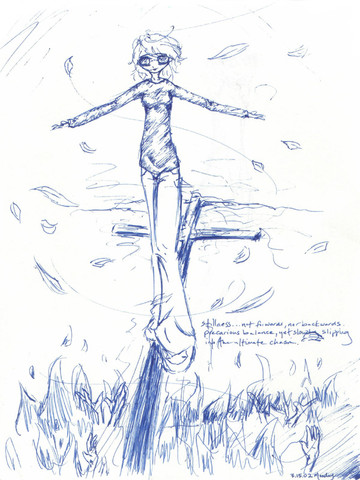 Full name Baabalaava. She needed a 'V' in her name, i thought ^_^ Don't ask who she is or where she hails from, cos i have nooooo idea. I just started doodling a girl in a big, bulky scarf, and then just added to it. Her expression fits her posture, i think. Arms held dociley behind her as she smiles to herself while waiting for...something. She's very enigmatic, Baaba is. I think i like her ^_^ Mebbe i'll color her later tonight; who knows.Related content