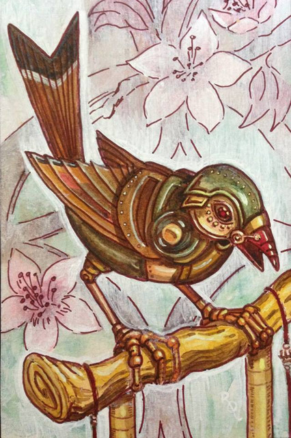 Assignment based on a hypothetical article about robot robin toys on sale in Japan. It's supposed to be for a bird watcher's magazine, so I emphasized the natural features of the Japanese robin, instead of designing a product as it would actually look. Watercolor, colored pencil and gouache.You may not use this artwork in any form unless you have my permission. If you wish to use it as a tattoo, I must be paid a creative fee. This image is copyrighted.