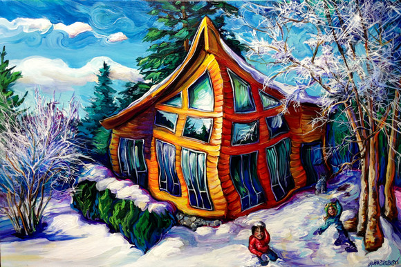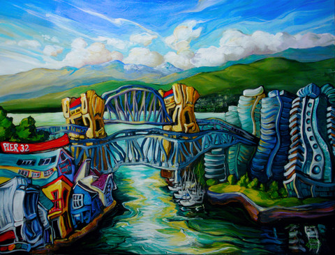 Acrylic on canvas, 24" x 36"Commission piece. This is a bright rendition of the Kits Point "dog beach" where people walk their dogs. More specifically, the white structure at the tip marks Elsje Point, a quiet little spit just down from the Maritime Museum.