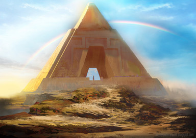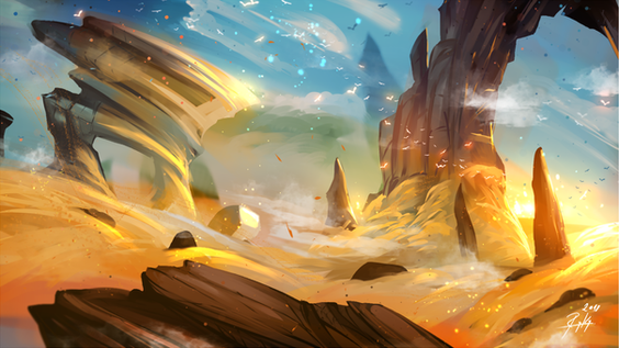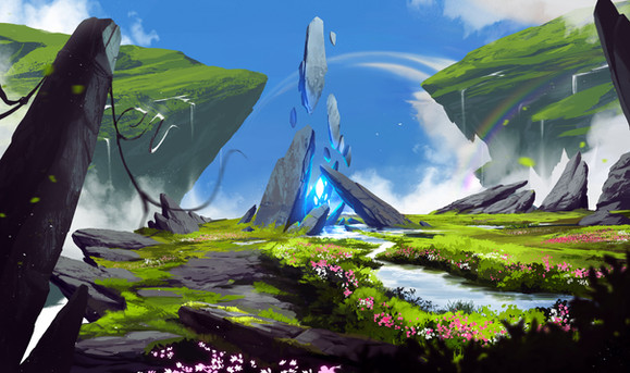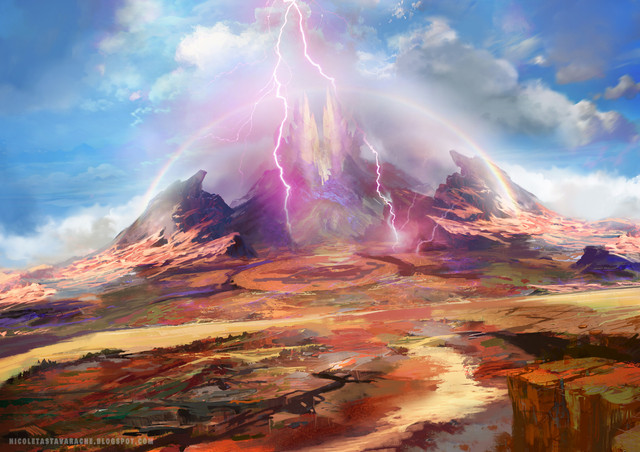 I love how you use color. You don't over-saturate, it gives a cool feeling of a worn out landscape. But in this case, there's the rainbow that gives off the touch of color above it ! I really like how you paint landscapes in general. You're very good !