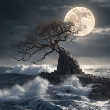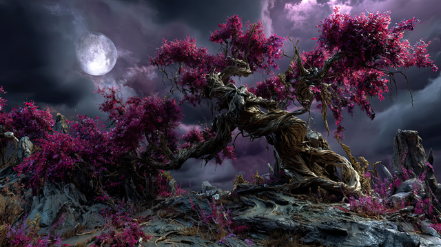 #digitalart #wallpaper #blossom #fantasy #fullmoon #landscape #moon #mystical #night #petals #rocks #sacred #serene #tree #twilight #violet