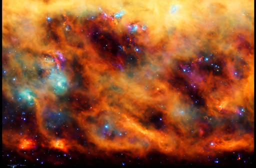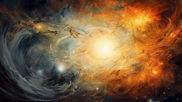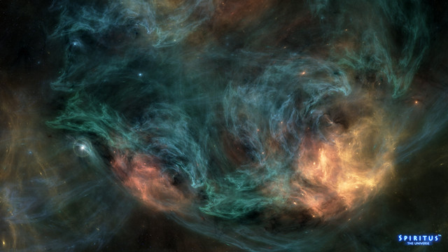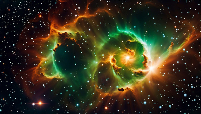 Two planetary nebulas combine in an epic dance of order and chaos. Orange and teal dust clouds mix for a beautiful light show4k desktop available