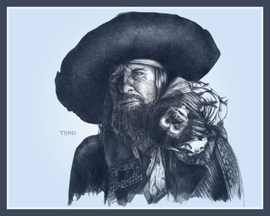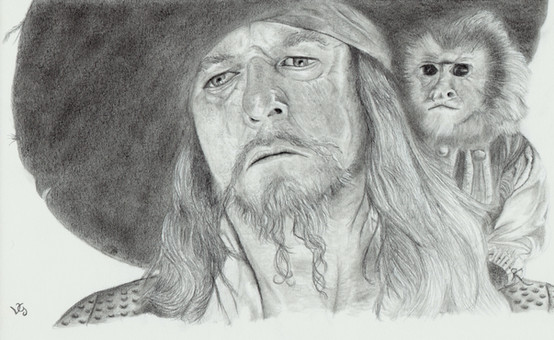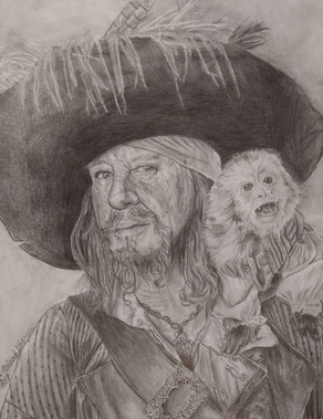 Pencil portrait drawing of Captain Barbossa (Geoffrey Rush) from Pirates of the Caribbean.Prints Available at: lanesandersart.darkroom.tech/