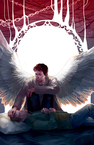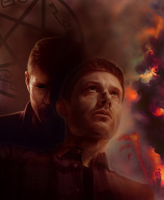 I like the second painting, too, but for different reasons. They seem to be hiding, but because the dangerous isn't immediate, this painting has no urgency in it. It's more peaceful, like they've been giving a chance to take a breather, and the soft color scheme helps to communicate this impression. I love the impressionist style in this one, and I love especially the background texture, which is gorgeous. There seem to be abstractions of hands emerging from the background, which is an eerie and intriguing touch. I do think I like the wings better here; I like the shape of them and the hints of long, long feathers. The only question I have is: What is that lighter-colored thing on Dean's shirt? Is it a chain? A chain from what? I can't tell. I feel like it's in too much shadow and needs more details.