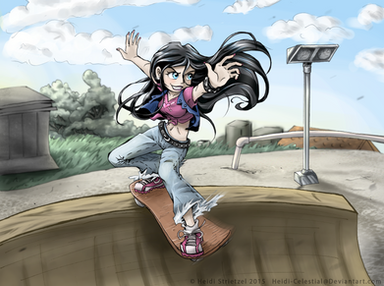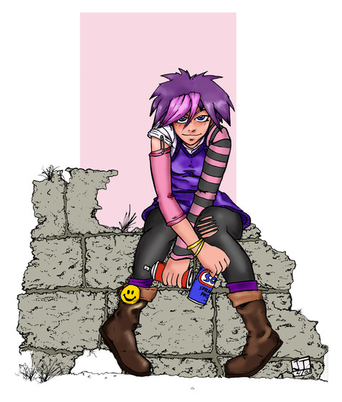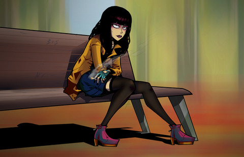 Man, the background on that is fantastic. Whatever coloring trick you did on the slide to make it look reflective, awesome. The character is pretty cool too. The two tone hair color shows some personality.
