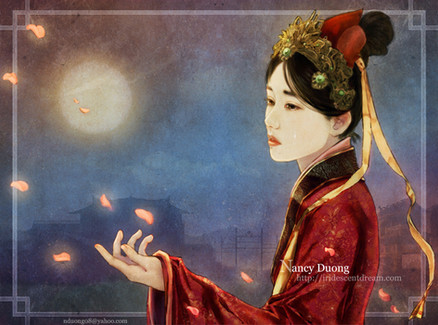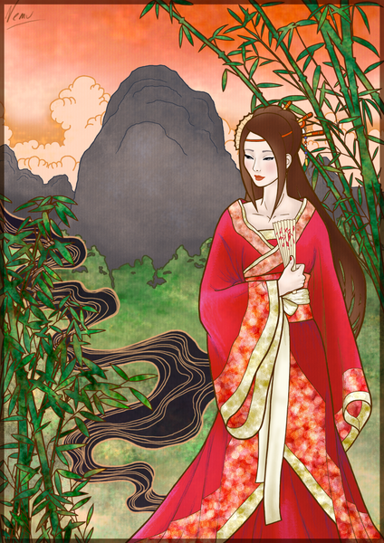 The lanterns and the cliffs in the background look great. And the lady's outfit is awesome. I like the overall green and pink/red color scheme too.