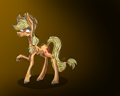 Oh, awwww, just look at the adorable little Applejack; she's even more charming when colored! This is lovely dear, and I'm so glad you decided to do it... the warm uplighting is very dramatic here, and though in a way it pains me to think of it I almost have to wonder if Applejack isn't trapped by a fire or something here (hopefully not, but certainly it would explain such an expression/body language). Whatever the case may be though, I think it's great, and thank you so much for coloring it largely because I wished to see it!