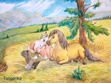 I really like the colors of this piece...very gentle and soft. I really like how Libertad is laying down and Sol is bending down to comfort her..really shows he's making an effort and truly cares