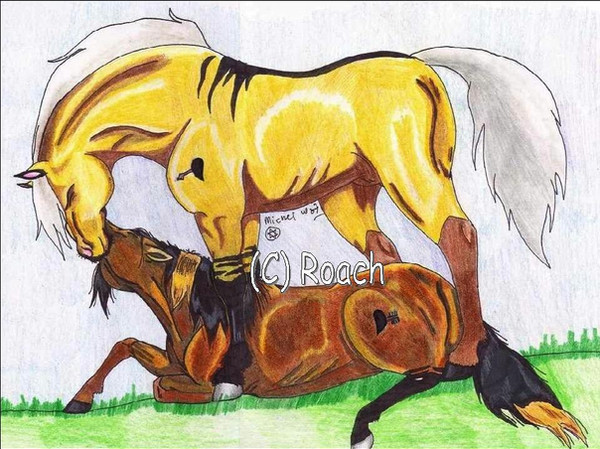 Please be mature, don't be like, "Oh my gosh! a penis!" Like any other obvious situation in a courthip between horses, the stallion has to get ready as he tests the mare before mating. So anyways, just a pic I did of Sol courting Libertad on their young years. No reff.Sol ©