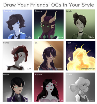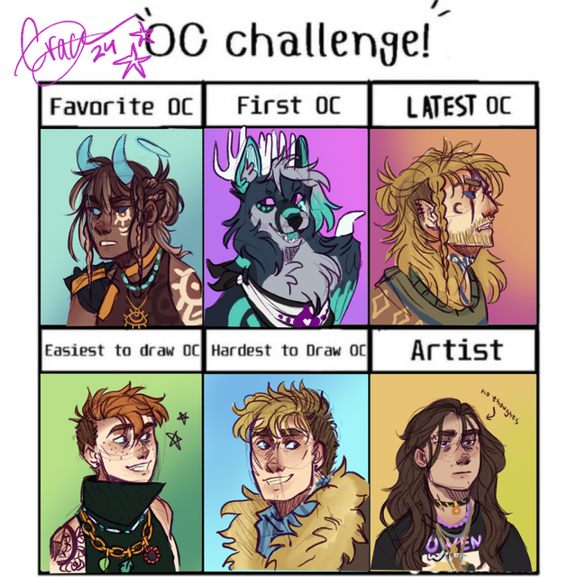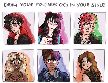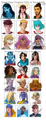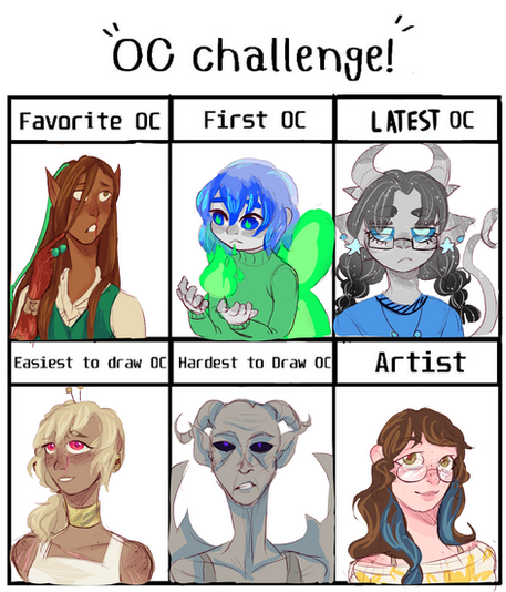The original asked for "latest character" but there were a number of problems with that: (a) I made a number of new characters during the course of drawing this (b) whoever my latest character is, I do not have a design for them, because I just made them and I need to get to know them a bit before knowing what they should look like. Hence "oc whose design I updated last".