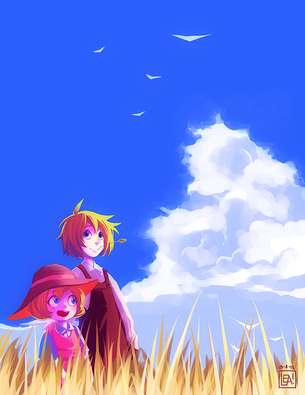 Ains! Que monada que es este dibujo! ^///^ Las nuves estan muy conseguidas, todo soft y dreamlike. (Aquí voy yo con el spanglish. xD) Aunque las sobras de detrás no pega con todo esto de los sueños, en mi opinion. Hace sentir que los personajes esten atrapados contra una pared mientras yo me imagino que en los sueños todo es más libre, con más espacio. Un fondo difuminado que insinuase que esten en el cielo habría quedado mejor. La siguiente vez, cuando estes apunto de acabar un dibujo mira lo que en ingles llaman "depths". Si quieres que parezca todo más reprimido, quita depth del dibujo (quitando sombras, añadiendo un fondo plano o añadiendo un borde). Si quieres que haya mucho espacio y "libertad" añade más depth (añadiendo sombras, usando un fondo donde se vee o se sugiere que hay horizonte).