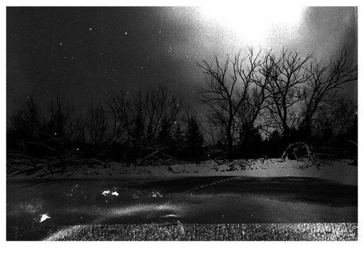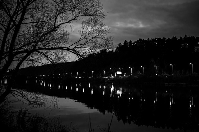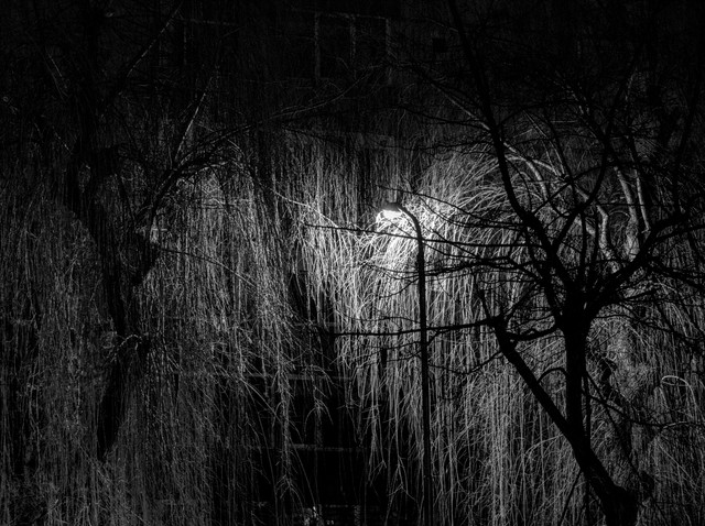 Beautiful, I love the way the lights look ghostly in the background and the silloutte of the tree limbs acts as a wall. Makes me feel seperated from the unknown. Love it def, a fav.