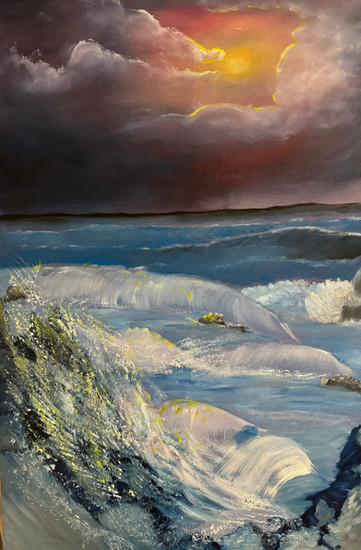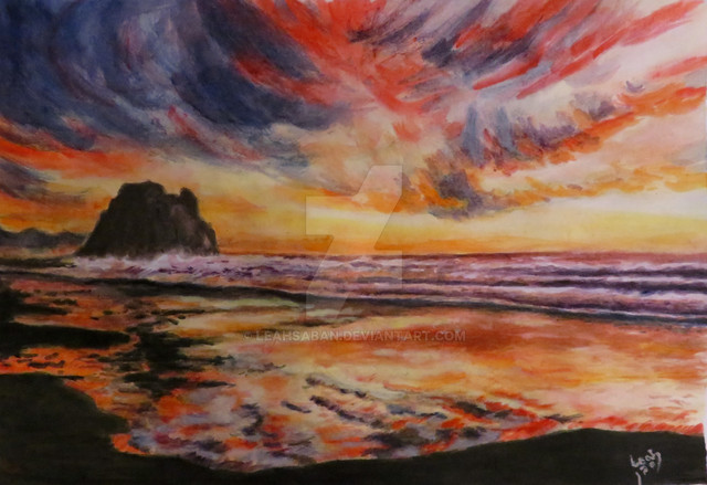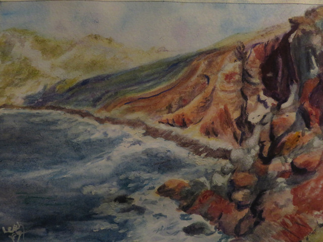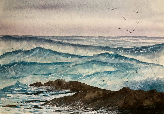 #sea #watercolour #traditionalart #beach #impressionism #waterscape #blue #brown #cliffs #rocks #seafoam #sundown #sunset #waves #yellow