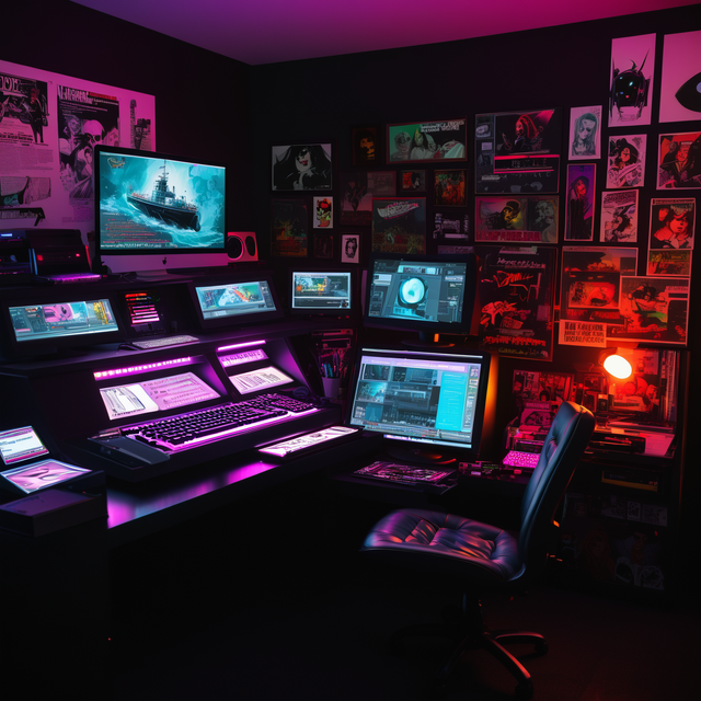 #80s #90s #ai #conceptart #cumputer #cyberpunk #digitalart #droids #electro #electronic #fantasy #gadgets #home #magic #music #neonlights #room #soundsystem #studio #synths #techno #visualart #synthwave #openai #leonardoai