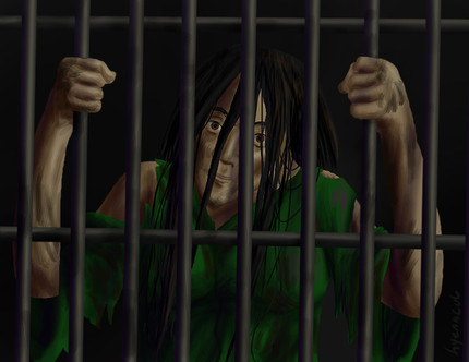 Seats on floor, stretching CHAINED feet away.