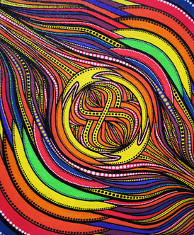 Acrylic paint, and metallic acrylic paint on stretched canvas over a wooden frame.
