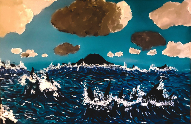 Acrylic and hand ground Mother of Pearl for the spraying water; on stretched canvas over a wooden frame.