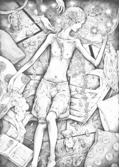 I think all those pieces and squigly shapes are all pieces of her life. They are small but they all build up herself, alone they won't show that much but together they complete her. She is looking on them to find herself, or she is looking or more places to fill out with more pieces