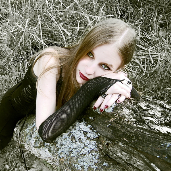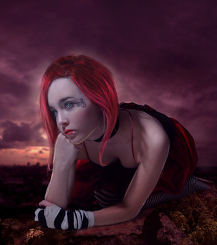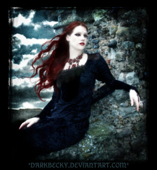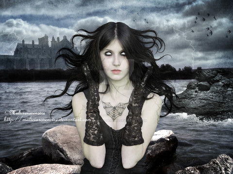 Breathtaking picture! Really... I like her look and the great view of mountains in the background! It's not really dark, but scary in a way ^^