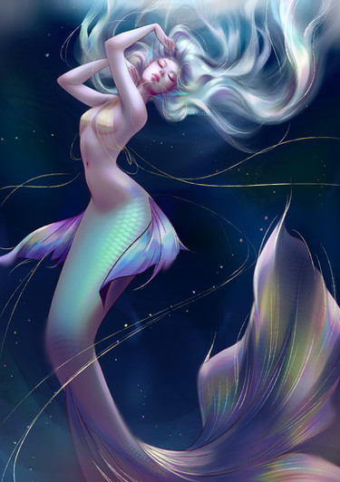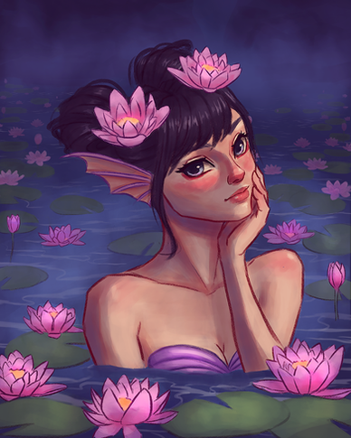 #blue #drawing #fantasyart #fish #flowers #green #hair #lotus #mermaid #night #painting #photoshop #pink #water #characterdesign #digitalpainting #fantasycreature #illustration #mermaychallenge #mermay2021