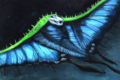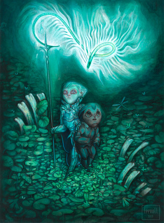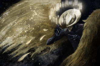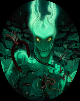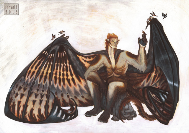 About illumination, you're totally right. It's a very dark painting and it needed some more light sources, because, excluding the wings that are very bright, it looks like the whole thing is being swallowed by darkness. I could have made darkness in a dark green tone instead of black, it would have made the piece more pleasant to look at.