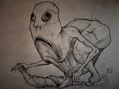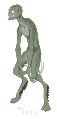 A few weeks ago I had a dream about this terrifying little creature. In the dream, I received pictures or videos of it and every new one I got it was closer and closer to the camera until it was just a lipless face with wide set, orb-like eyes dominating the entire photo. The last thing I remember from the dream was looking up from my computer screen and seeing it sitting in the threshold of the door. This is the closest approximation I can get to what I saw. I'm sure it's face is correct but I do think it was a bit darker in tone.It may be the Rake, but I cant be sure because the Rake is supposed to be either grey or almost ghost white and my monster certainly had color.