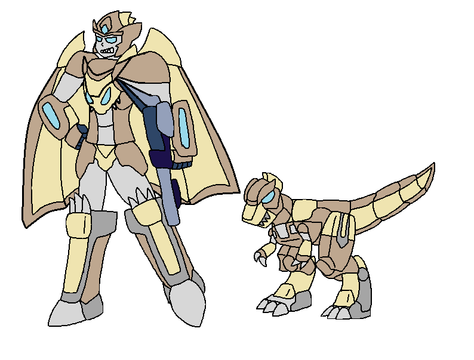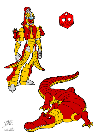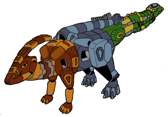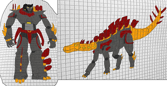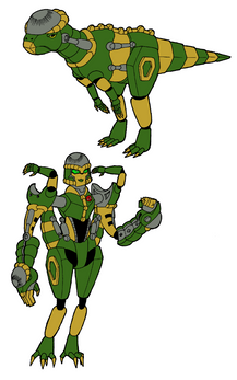 One night I dreamt that to conter some big threat, Ratchet had to investigate the power of sugar and three of the Dinobots developped a technique to combine: while Sludge formed the lower body and the legs of a bigger Tyrannosaurus, Snarl the upper body and head (with his plates becoming the teeth) and Grimlock the tail (the rationale being that a dinosaur with two heads can deal more damage).So I took this idea (sans the Ratchet part) and made OCs of them.