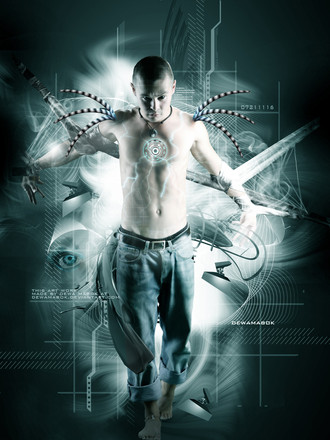 This is really good work. At first I didnt even notice the manips on you. Cause I was really looking at the bottom area and the surroundings. The boxes with the stock photography are pretty cool. I like the glowing rigns too. The manip is really good. Love the arm area. Great work!