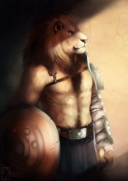 This is really well done. Titus is definitely one of my favorite artists. You are well on your way. I do feel for your boy Khar'ei this is an incredibly powerful picture. I especially love your lion. His sword is awesome. I love the spartan type sword and his mane. That's probably one of the smoothest flowing mane/ hair do I've seen. There is a lot of powerful emotion here and I love it. Very well done.