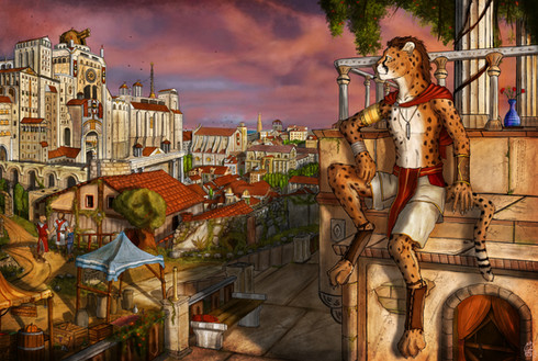 Something about picture: This scene presents moment after redeemed young Khar'ei from slavery by Felix Secundus Magnus. Then Khar has become foster son of Felix, and he started education in Academy at the archeological faculty, which is practically unseen situation. You know... Rich imperial lion has adopted slave cheetah!