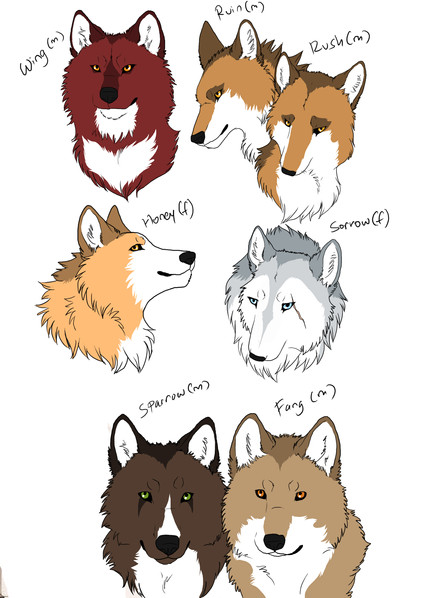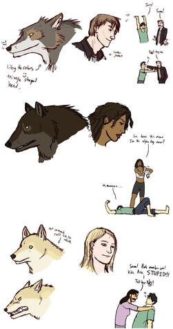 Some of them are kind of subtle. The idea is that in their wolf form they are more expressive than real wolves, but still limited anatomically as to how human their expressions can be. There has to be a mixture of human and animal body language. Also, I tried to match them more to a particular subspecies of wolf rather than making their hair/fur colors match.
