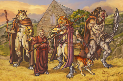 Três fiannas em crinos e um peregrino silencioso em hispo.