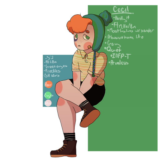 Elliot spent most of his time in the foster care system until he was around 14 and got adopted into a family that was nice and cool and good. Before he was put into the system he came from an extremely abusive family, due to his being,, not the average type of person? He's ftm (female to male) Transgender, and a lot of the abuse he faced came from that, he's also a person with albinism. Years spent in the system and abuse gave him a condition called selective mutism, meaning in certain situations he is mute due to anxiety.