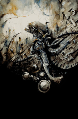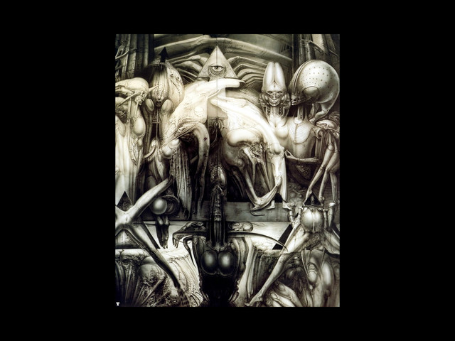 Sons of motherless goats stalk streets of dragons under the stone eye of the Lion de Belfort and skin flows in the warm breeze of lunar eclipse. Large format surrealism inspired by Max Klinger and H.R. Giger. Drawn while watching good old "Columbo".Related content