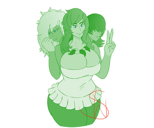 I like that both heads seem to have their own personality. Blue seems more bold and forward (she's a ten foot tall cyclops, why shouldn't she be?) and Green seems a little shyer, or at least more overwhelmed with this gentleman's good looks.