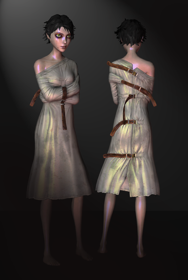 If you are going to draw "Milla the Psychic" then make her straight jacket look all intimidating by dying it black and giving it some stitching with thick white string.
