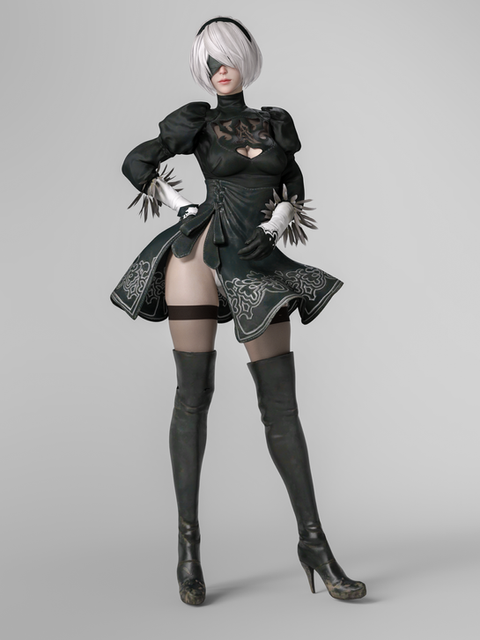 I am unsure of how much credit to give you for the execution of her figure and clothing, as you do not say if this is a rip from the game's files, or a re-creation by you or some third party. I see that you've listed DazStudio in the tags, so I'm going to assume you actually dialed-in 2B from one of the female figures yourself, and that her outfit is something you pieced together from existing clothing for whichever figure was used. I also note that her hose in the game are skin-tight (likely a texture rather than separate polygons) and the hose here is standard DazStudio conforming clothing, 'floating' a half-inch over the skin, which makes me think you actually built the outfit, rather than ripping it.