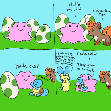 This is how I think the Pokemon in the 'gender unknown egg group' (or all Pokemon in general) are tricked into breeding with Ditto. If you don't know, Pokemon in this egg group can only breed with Ditto. They can't even breed with their own kind! Just imagine their happiness when they actually produce an egg.ΒAnyway, it's sad that Ditto can't breed with other Dittos.