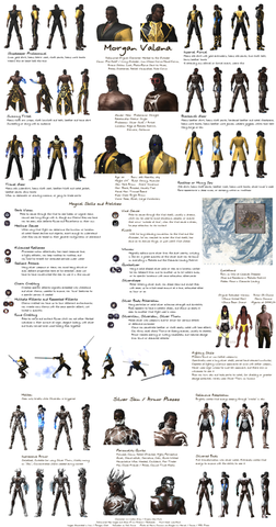 Moraga Vasquez - the Paragon version of him cleans up really nicely. Except those boots. Man, what the hell is with those boots. Wilson made you some *nice* ones. But nooo, you gotta have those things clompin around. Moraga has such issues. This is not his 'first' visit to an alternate world, and probably won't be his last. He's actually not the "original" Moraga. In fact, he's not even the SECOND Moraga (who lives alternately in Twoarth's Carramba High as a teacher and on Zekira as ... well, whatever it is he does there). This is a copy of a copy. Of all the people on this list, this version of Moraga would be the angstiest. I'd made him in Paragon shortly before the end of days, wearing a more normal version of his outfit - and, some gorgeous others, which he's got on his own pages in here somewhere.