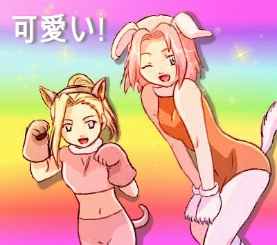 Tenía curiosidad por saber como serían las chicas de Naruto con las pintillas de la otra y este es el resultado ..Personalmente, mi favorita es Sakura, con el traje de Ino, y la que menos me gusta es Hinata vestida de Tenten, no le pega mucho =/