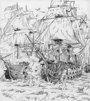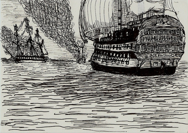 If I may offer some critique...this is very good especially the sails and rigging, however the hulls of the ships, mainly the ship o' the line up front, could do with a bit more work