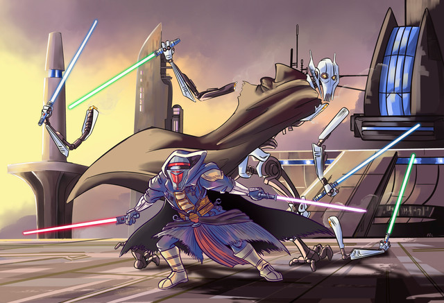 a sunset confrontation with swords on a cliff.redraw of an ilustration from 2010.