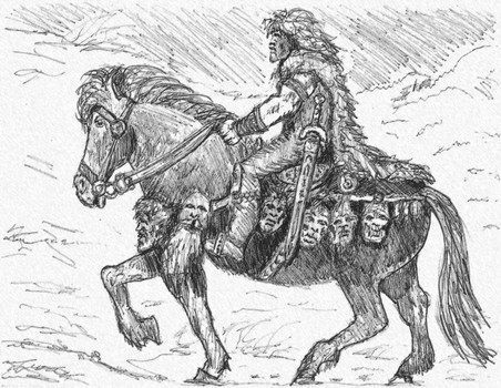 This is the Gan Ceann, more commonly known as Dullahan. I wonβt go into the legend, thatβs what Wikipedia is for. Suffices to say that this is what The Legend of Sleepy Hallow was based off of. He classically has a whip made of human spi9ne bones, has big eyes and a huge toothy grin. He is a horseman.Related content