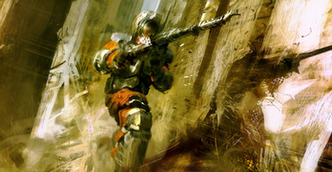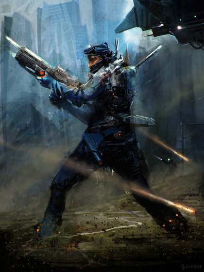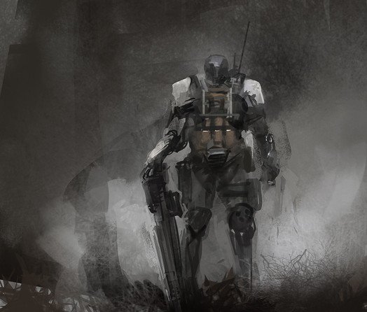 I like the look of the gun, makes him seem powerful. Yet his slouch and tired demeanour make him seem more human, despite the weaponry.