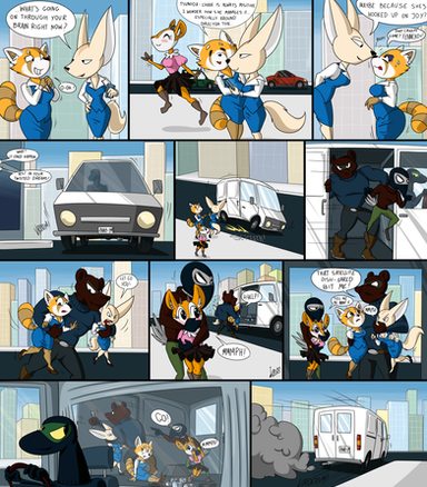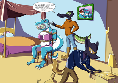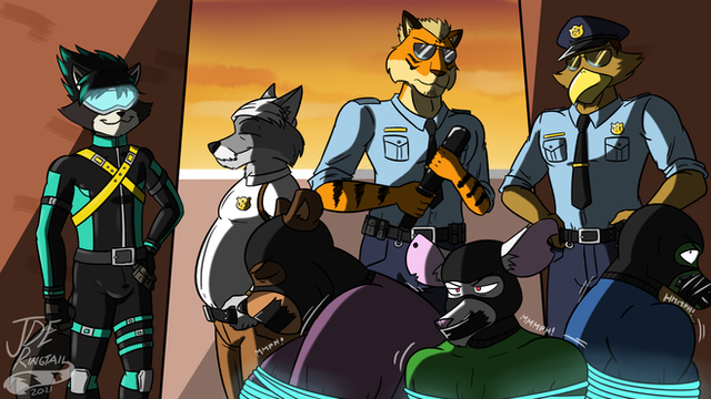 A trade picture I did withHis characters Charlotte the polar bear and Ava the T-Rex are being captured at a strip club by aome rat goons. They probably conside them as the best loot they can carry ;3