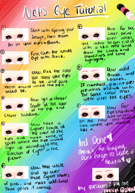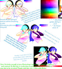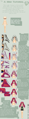 While making a doll, I got bored and thought 'I should do a WIP,' then I thought 'I could make this into a tutorial too.' I added some of my own comments to the screens. This doll started out as me wanting to try a bunch of different things. I wanted this to show how I work. Some people don't know that MS Paint is an amazing program for pixeling.I usually start out by having my pre-made palette in the corner set on a color so that I can see the light colors well. The palette was a pain in the back making, but well worth it. It has just about any color I could want. If anyone wants it feel free to ask and I'll post it. That little typed up plan for the doll really helped me. Usually I make it up as I go, but that doesn't help much. I nearly always have an alternate idea that pops up, so I draw it separately and if I like it I keep it or if I like both I keep both. I start my doll by drawing on the outlines of the clothes, hair, shoes, etc. Then I choose colors, having outlines helps me create the picture in my mind and see how the colors would look together. Basically it's so I can see the finished doll with colors in my head. I always have the base with changed eye color and/or makeup available at all times because I usually want to change something along the line somewhere.