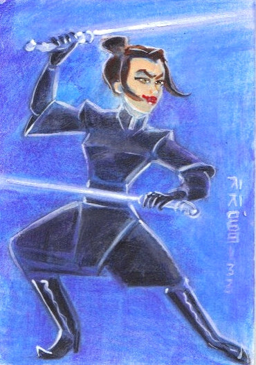 The method I was using at the time to transcribe the under scetch to the illustration board left the figures a little stiff looking. I don't do it that way anymore. In the anime series "Bleach" Rukia's mouth is usually no more than a single line. One can't see her lips unless they are in profile.