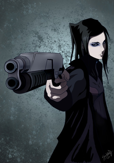 Anyhow, smokin' job on the trenchcoat/bodysuit ensemble, purposeful baby blues, oh-so-stylized...err...hairstyle (truly an anime staple), and even those practical-looking pistols.