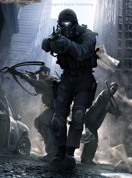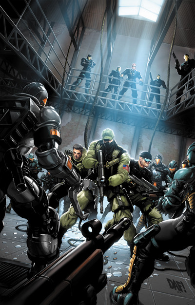 Wow, this is excellent. Very good lighting and shading, everything looks smooth and highly detailed. The only thing I see is that the front guy's arm looks a little big. But hey, bitchin' job. Off the see the rest of your stuff.
